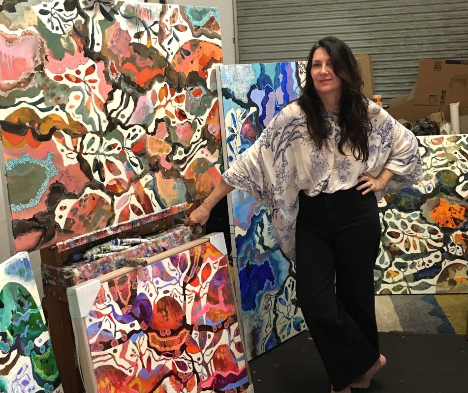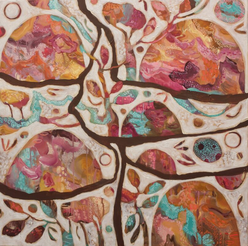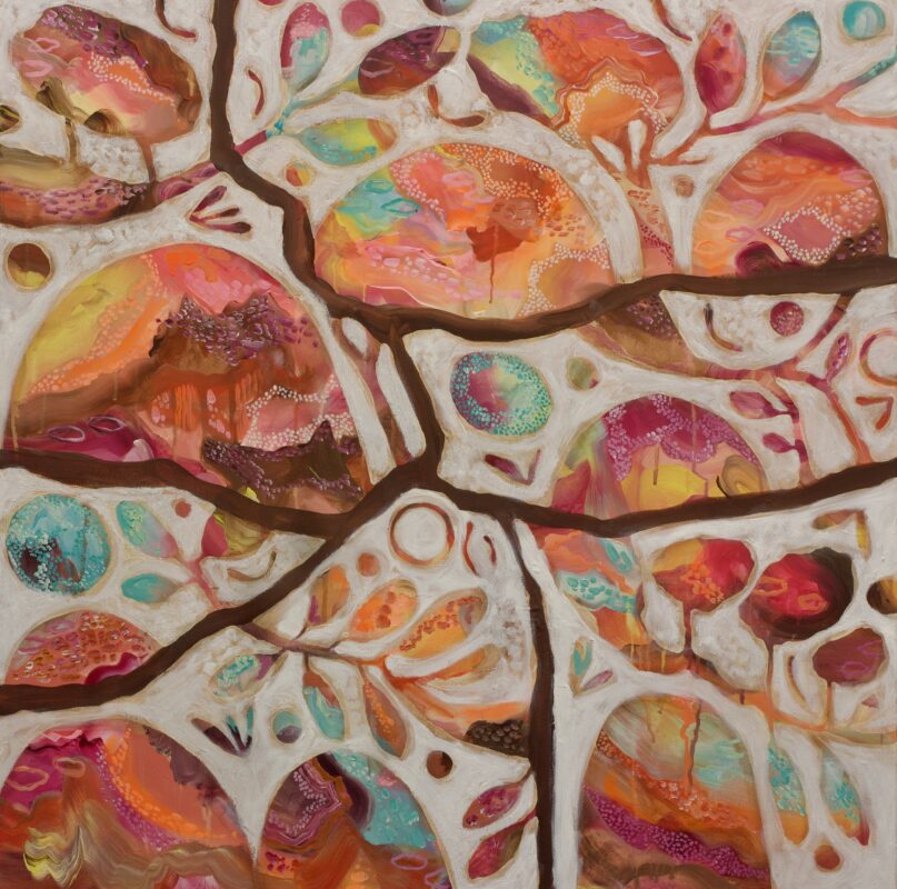Having spent over a decade experimenting with applications like jewellery and textile design, it was a natural progression for me to start painting. My background in costume for film and television and a passion for textiles – primarily tribal and ethnic designs – has influenced my painting style. I’m self taught, and it has only been through practice and time that I have nurtured my style. I grew up in the Barossa Valley surrounded by vineyards and wide open spaces, and in so doing, developed a deep concern with natural forms connected to life – plants, bones, feathers, hills, trees, stones, and water. More and more I realise that my paintings are a path of self discovery and an expression of life’s experiences. As an artist, I understand that nature and life have a lot to offer. These works reflect a kind of juxtaposition of the landscape around me. Cutting, chopping, and reassembling pieces together again from a scrapbook of memories and imagination. Small dots and markings represent natures gifts from the elements.